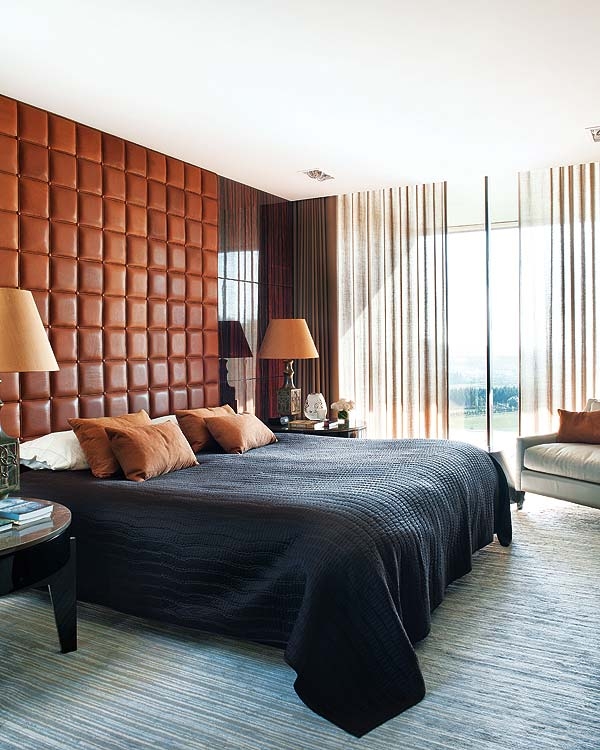 pillows, lamps and wall are harmonized by a black bedspread. In whole,